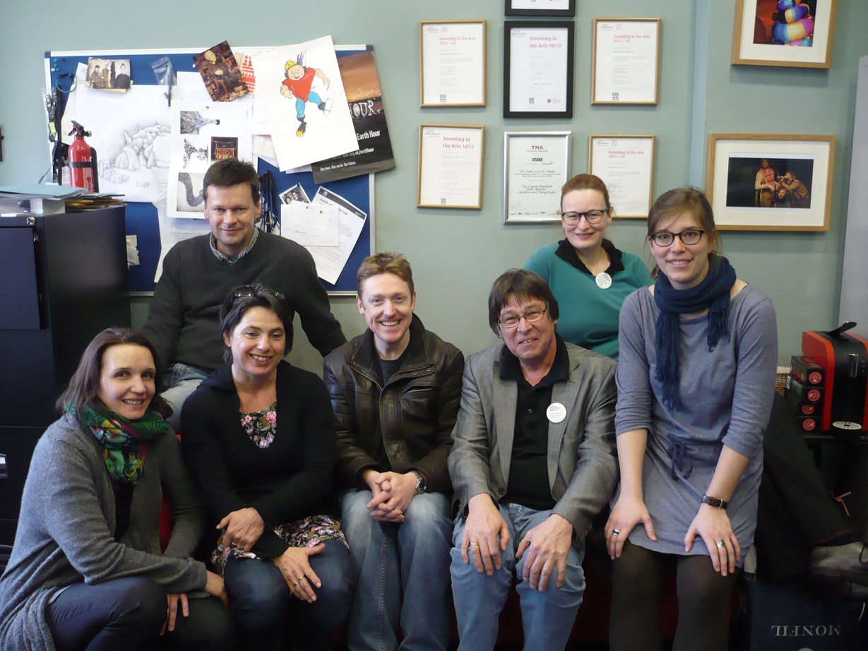 Die Mittagspause nutzten wir, um uns von Paul McEneaney die Räumlichkeiten der Kompanie “Cahoots NI“ anzusehen. Mitten im Herzen der Stadt Belfast hat diese Theatergruppe in einem nagelneuen Einkaufszentrum auf zwei Etagen eine riesige Fläche zur Verfügung, in denen geprobt wird, Bühnenbilder und Kostüme entstehen. Die Räume werden vom Besitzer des Einkaufszentrums unentgeltlich zu Verfügung gestellt, da sich dieser eine hohe Summe Steuergelder spart, wenn er die Räume einer gemeinnützigen Institution zur Verfügung stellt. Wir staunten über dieses ganz andere System der Kulturförderung und waren von der win-win-Situation schlichtweg begeistert.