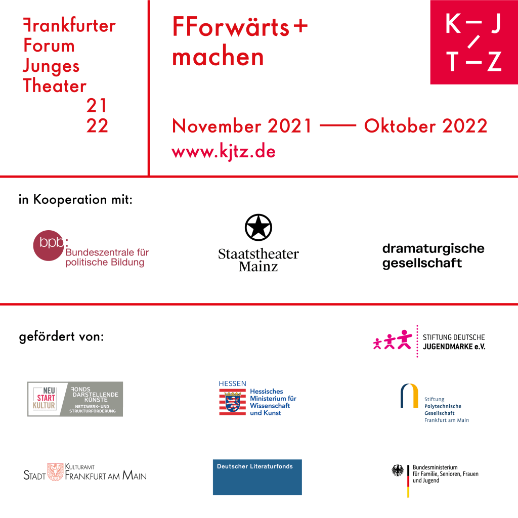 Der dritte Teil des „Frankfurter Forum Junges Theater: FForwärts+machen“ ist eine Veranstaltung des Kinder- und Jugendtheaterzentrums in der Bundesrepublik Deutschland (KJTZ) in Kooperation mit der Bundeszentrale für politische Bildung (bpb) und dem Staatstheater Mainz.