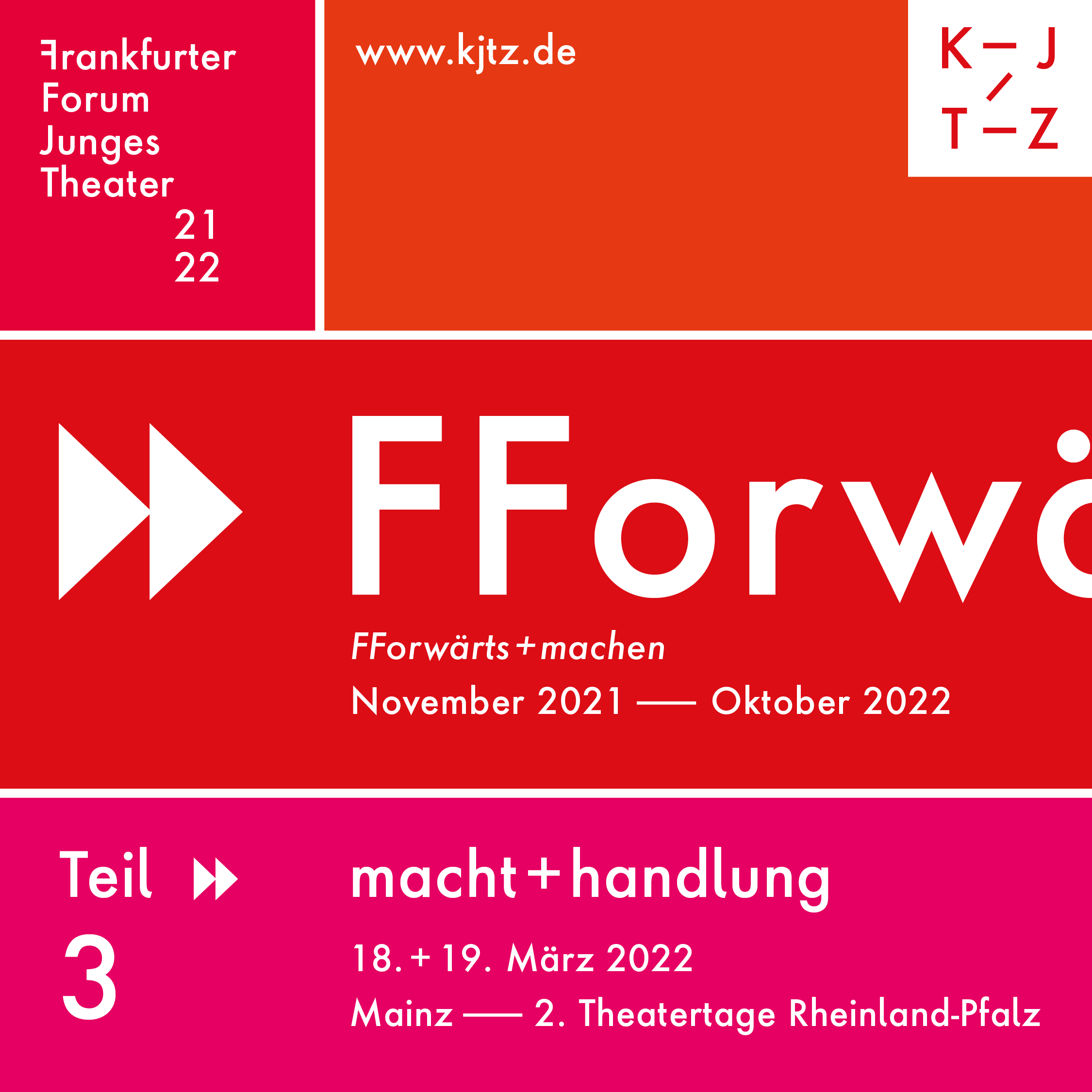 Der dritte Teil des „Frankfurter Forum Junges Theater: FForwärts+machen“ ist eine Veranstaltung des Kinder- und Jugendtheaterzentrums in der Bundesrepublik Deutschland (KJTZ) in Kooperation mit der Bundeszentrale für politische Bildung (bpb) und dem Staatstheater Mainz.