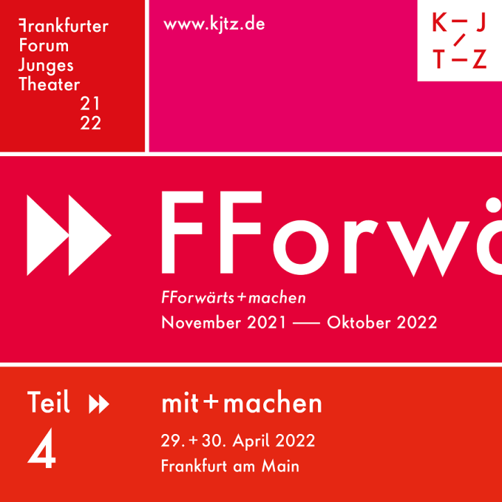 * Das Frankfurter Forum Junges Theater: FForwärts+machen ist eine Veranstaltungsreihe des KJTZ in Kooperation mit der Bundeszentrale für politische Bildung (bpb) sowie dem Staatstheater Mainz, der Netzwerkinitiative „Talk ohne Show“ und der Dramaturgischen Gesellschaft (Teilveranstaltungen).