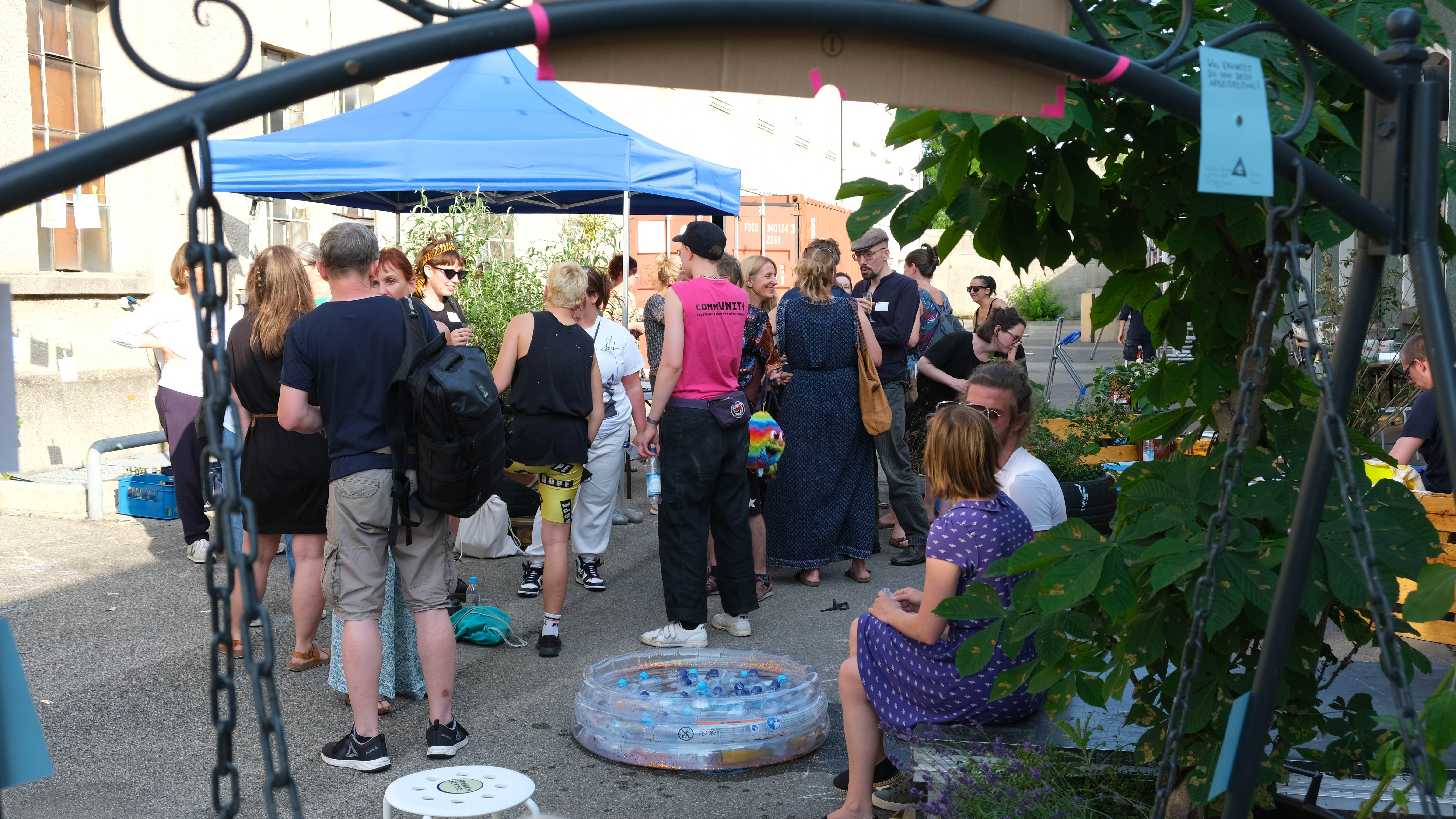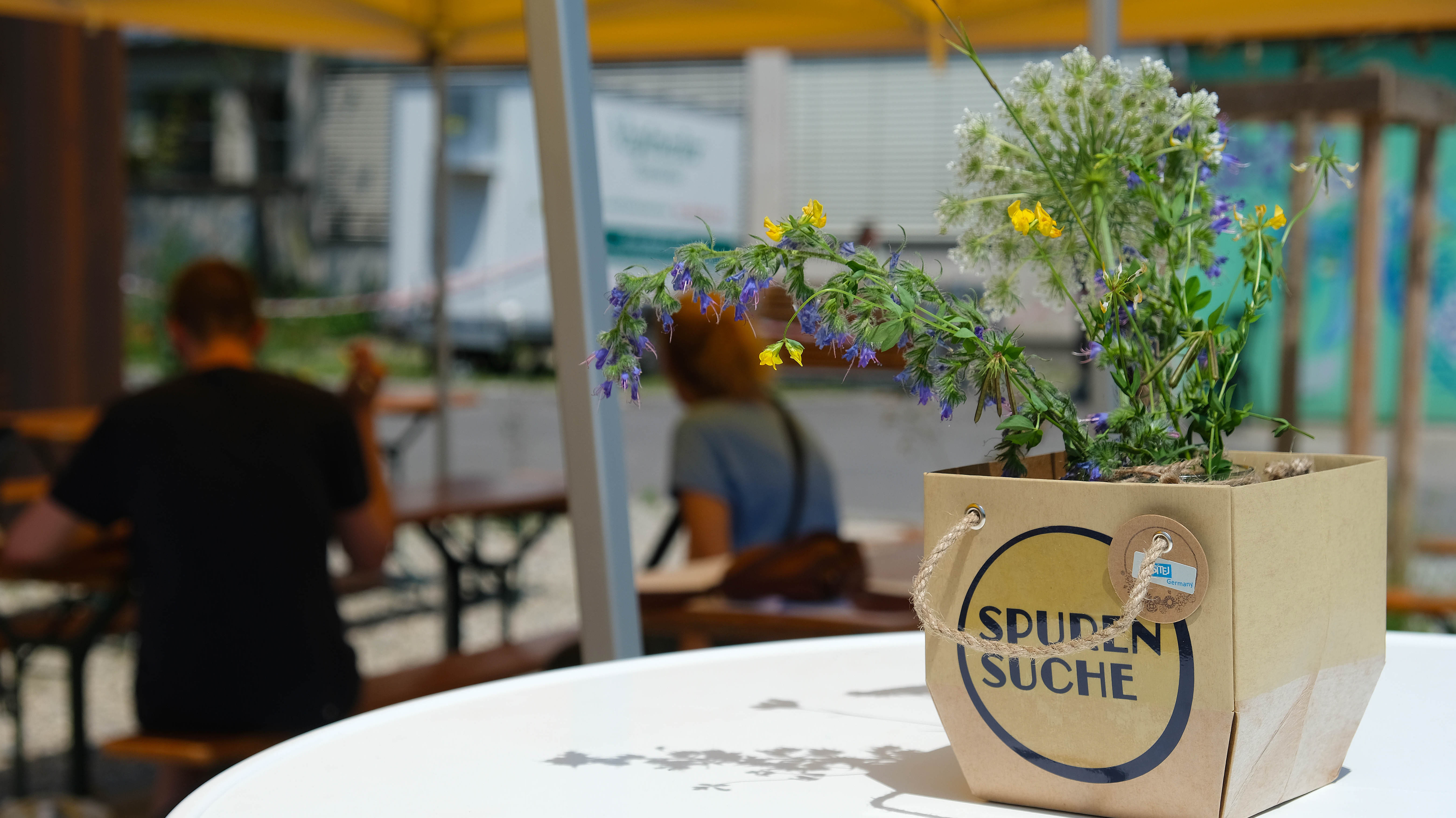 Die Spur ist gelegt. Vom Eingang auf das Gelände von schwere reiter und Pathos Theater führt eine bunte Spur Kreide-Konfetti zu den beiden Spielstätten. Und zum Basislager. Im Hof des Pathos hat die Geheime Dramaturgische Gesellschaft (GDG) einen Ort geschaffen, der zum Verweilen und zum Austausch einlädt. Der erste Punkt aus der Neukonzeption des Arbeitstreffens der Freien Szene für Kinder- und Jugendtheater funktioniert. Auf der Hollywood-Schaukel nehmen Menschen Platz, ebenso auf liebevoll dekorierten Holzmöbeln. Dazwischen stehen Pflanzen und zwei Pools – in dem kleineren werden Getränke, in dem größeren Füße gekühlt. Menschen, die sich zum Teil nie zuvor gesehen haben oder sich bereits über mehrere Jahrzehnte mit Kinder- und Jugendtheater beschäftigen, kommen zusammen und kommen ins Gespräch. Die SPURENSUCHE hat sie zusammengebracht und die Angebote der GDG bringen sie zum Reden.
