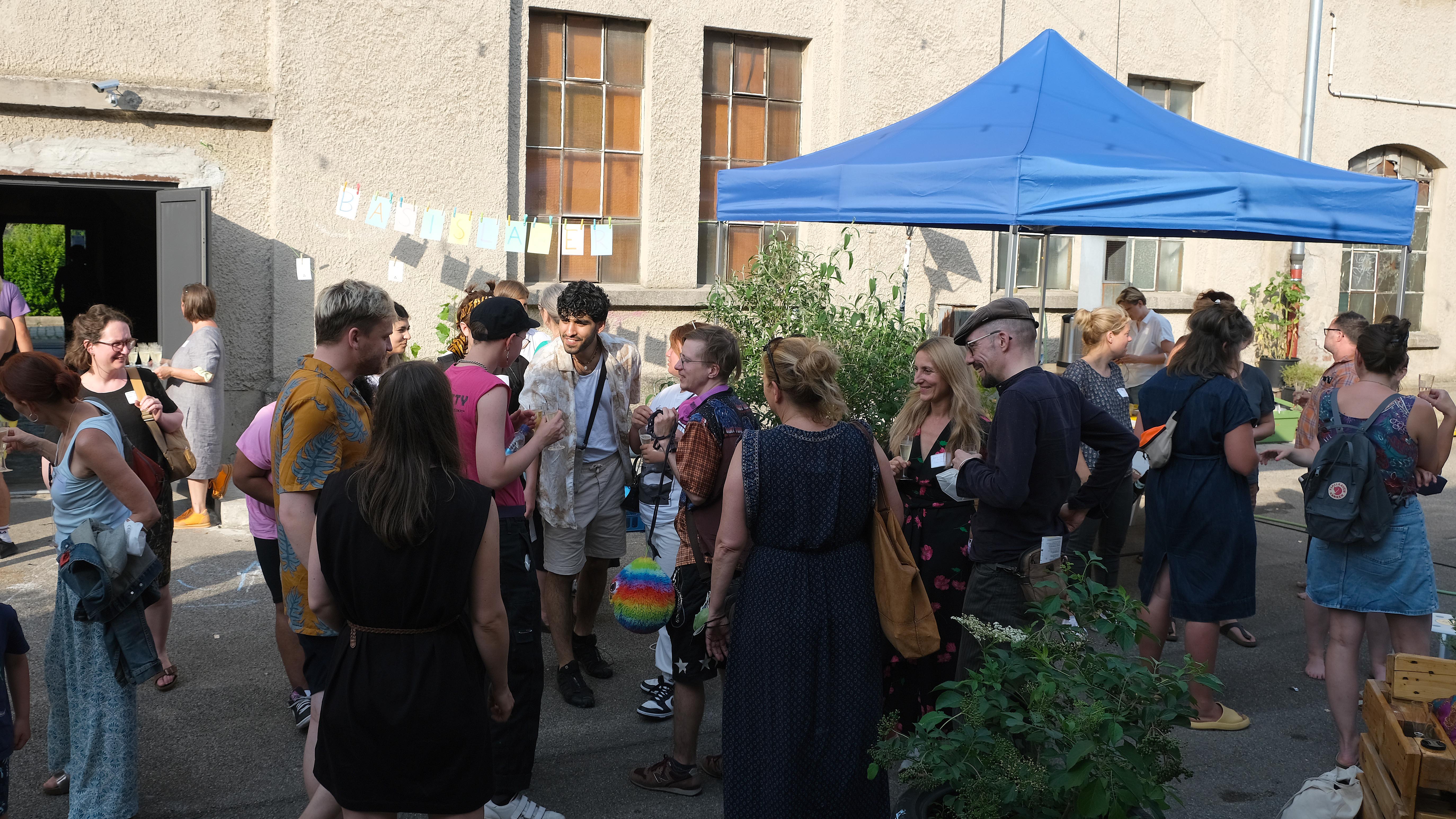 Der erste Abend klingt mit Sekt und Geselligkeit aus. Es ist lange warm und hell. Menschen, Gespräche und der Ort laden zum Verweilen ein. Und ja: Auch wir, die die SPURENSUCHE 2022 konzipiert und vorbereitet haben, wollen uns jetzt kennen lernen. Denn nach zwei Jahren in Zoom-Meetings und Telefongesprächen, sehen sich viele zum ersten Mal live. Und ja: Für viele von uns ist es seit mehr als zwei Jahren das erste Festival. Das erste Mal, dass wir wieder spüren, was es bedeutet, Kunst zu machen. In unterfinanzierten kulturschaffenden Strukturen, in überfordernden persönlichen Strukturen und für Kreativprozesse eher ungeeigneten digitalen Strukturen sind wir doch alle immer noch mit Herzblut dabei. Und das geben wir gern, denn wir glauben daran, dass es für eine gute Sache ist. Klingt pathetisch? Zu fragmentarisch? Wir werden sehen, ob wir mehr Spuren und Zusammenhänge, mehr Antworten auf all die offenen Fragen finden in den kommenden Tagen zwischen Konfetti und Kaffee, in Workshops, Inszenierungen und Gesprächen.
