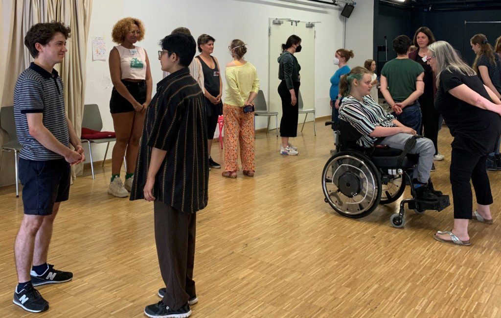 Das Aufwärmen haben Kennet und Henri im Vorfeld geplant und alle im Raum zu einer Runde Stopp-Tanzen eingeladen. Wir tanzten zu bekannten Pop-Songs und mussten stehen bleiben, sobald die Musik aus war, wer sich trotzdem bewegte, musste ausscheiden. Danach spielten wir das Molekül-Spiel: Dafür liefen wir alle quer durch den Raum und bei einem Zeichen von Henri mussten sich spontan kleine Gruppen zusammenfinden, die eine Aufgabe erfüllen mussten, wie zum Beispiel Grimassen schneiden oder pantomimisch ihr Lieblingstier darstellen.