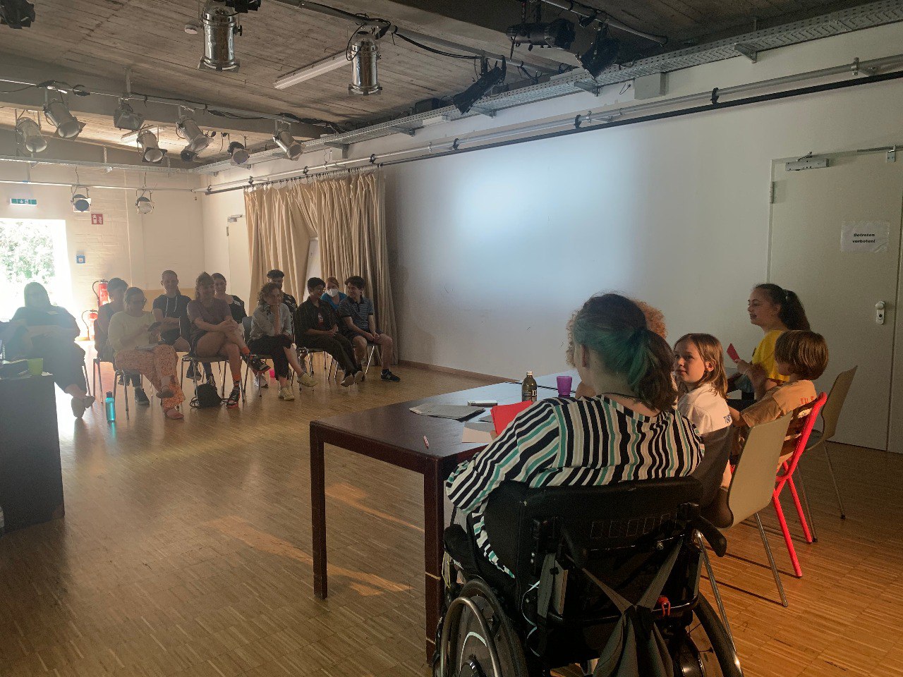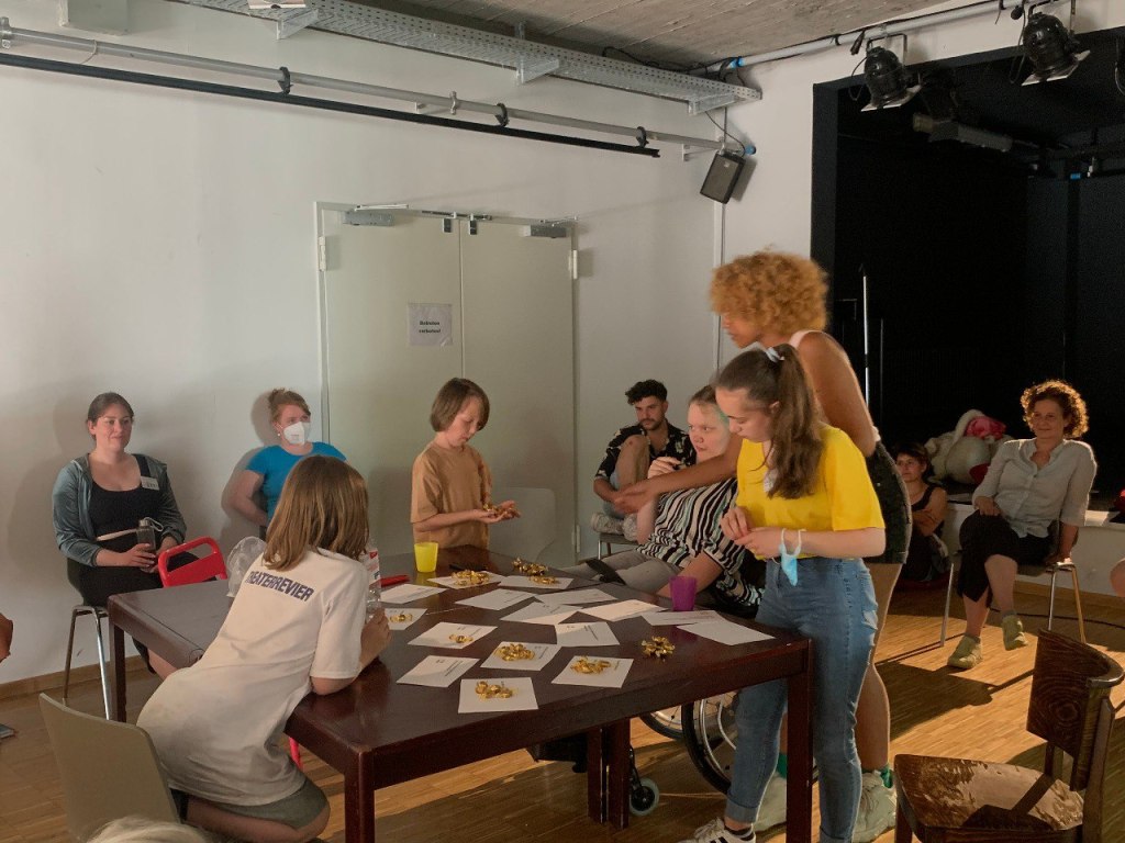 Das lag wahrscheinlich auch viel an der Offenheit der Erwachsenengruppe. Da sie sich wahrscheinlich sowieso schon mit Machtverhältnissen im Kinder- und Jugendtheater beschäftigen und sich dafür interessieren, Kindern und Jugendlichen mehr Verantwortung zu übertragen, hatte man nie das Gefühl, dass sie uns, unsere Aufgaben oder Positionen wegen unseres Alters hinterfragen. Stattdessen wurden während der Pausen Gespräche auf Augenhöhe mit uns angefangen, um unsere Entscheidungen besser zu verstehen.
