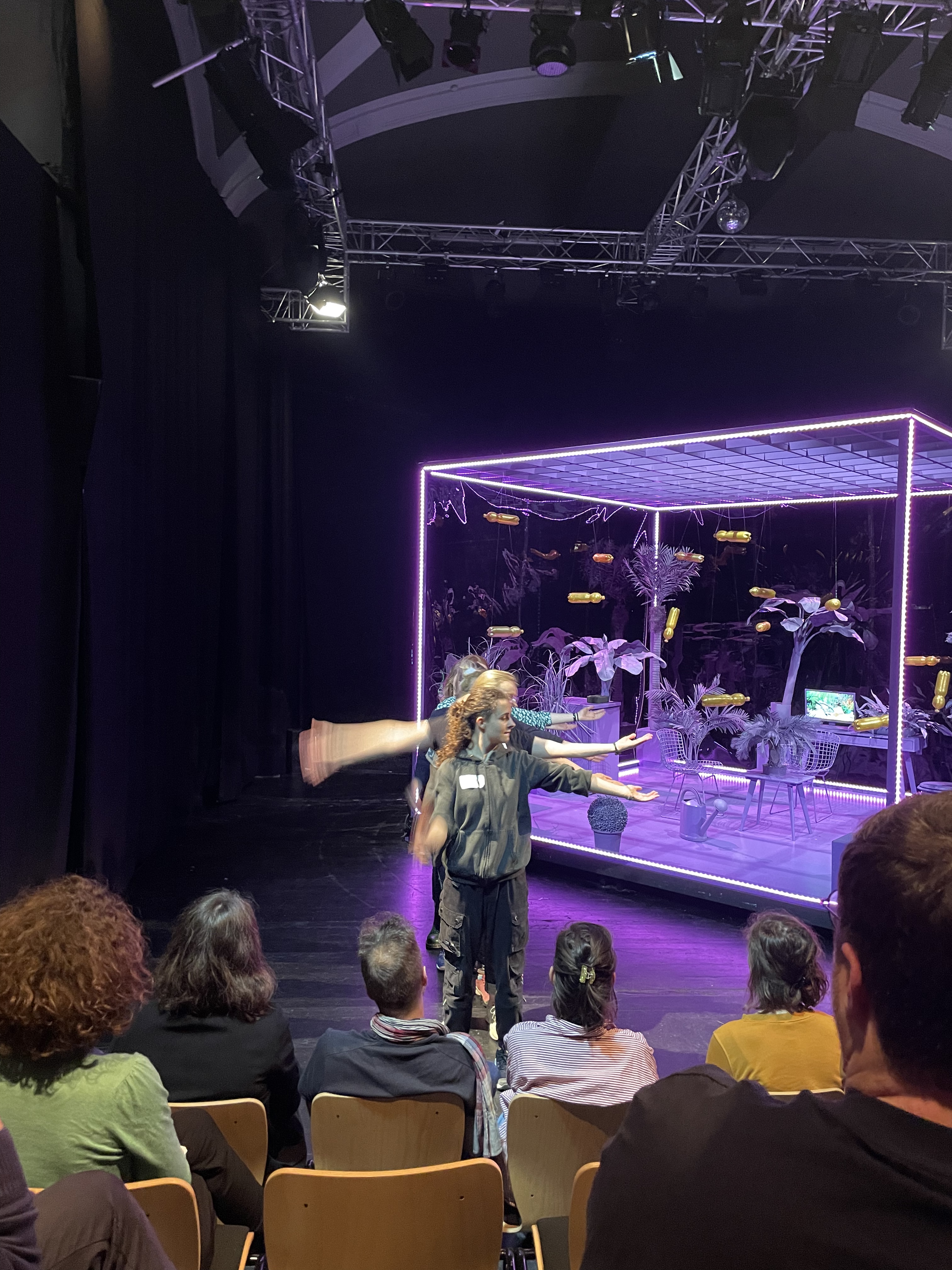 Beim anschließenden Nachgespräch mit Regie und Ensemble tauschten sich die Teilnehmenden und auch die zwei siebten Klassen im Publikum zu ihren Eindrücken der interaktiven Inszenierung aus.