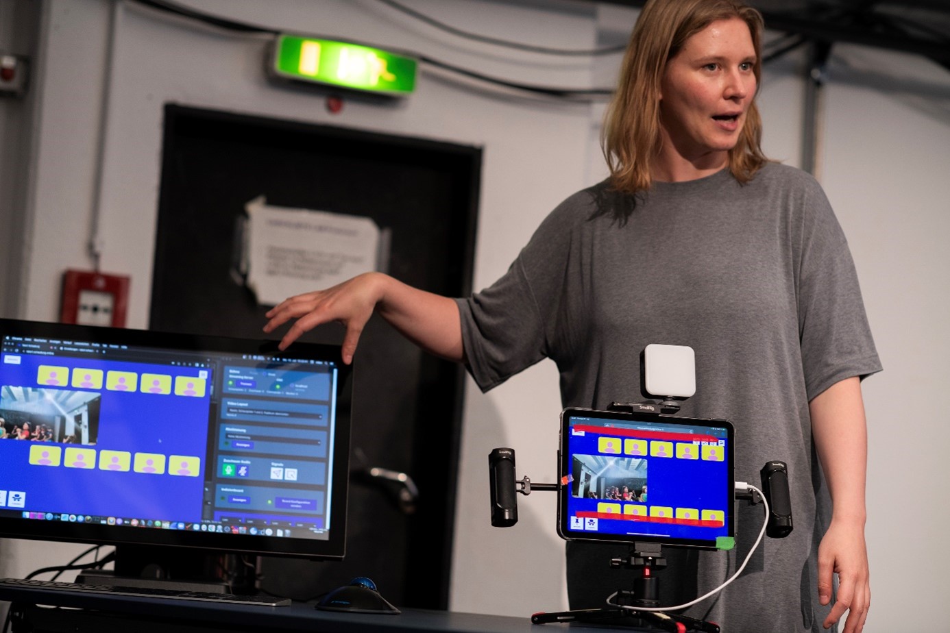 Die Tool-Oberfläche kann je nach Bedarf zentral von der Technik oder der Workshopleitung flexibel gesteuert werden, z.B. kann zwischen verschiedenen Ansichten während einer Inszenierung oder eines Workshops hin- und hergeschaltet werden, um neue Situationen oder Szenen zu markieren. Funktionen, die den Zuschauenden zur Verfügung stehen, wie Mikrofonsteuerung oder interaktive Elemente (bspw. Emoji-Reaktionen), können von Technik und Workshopleitung punktuell aktiviert oder deaktiviert werden.