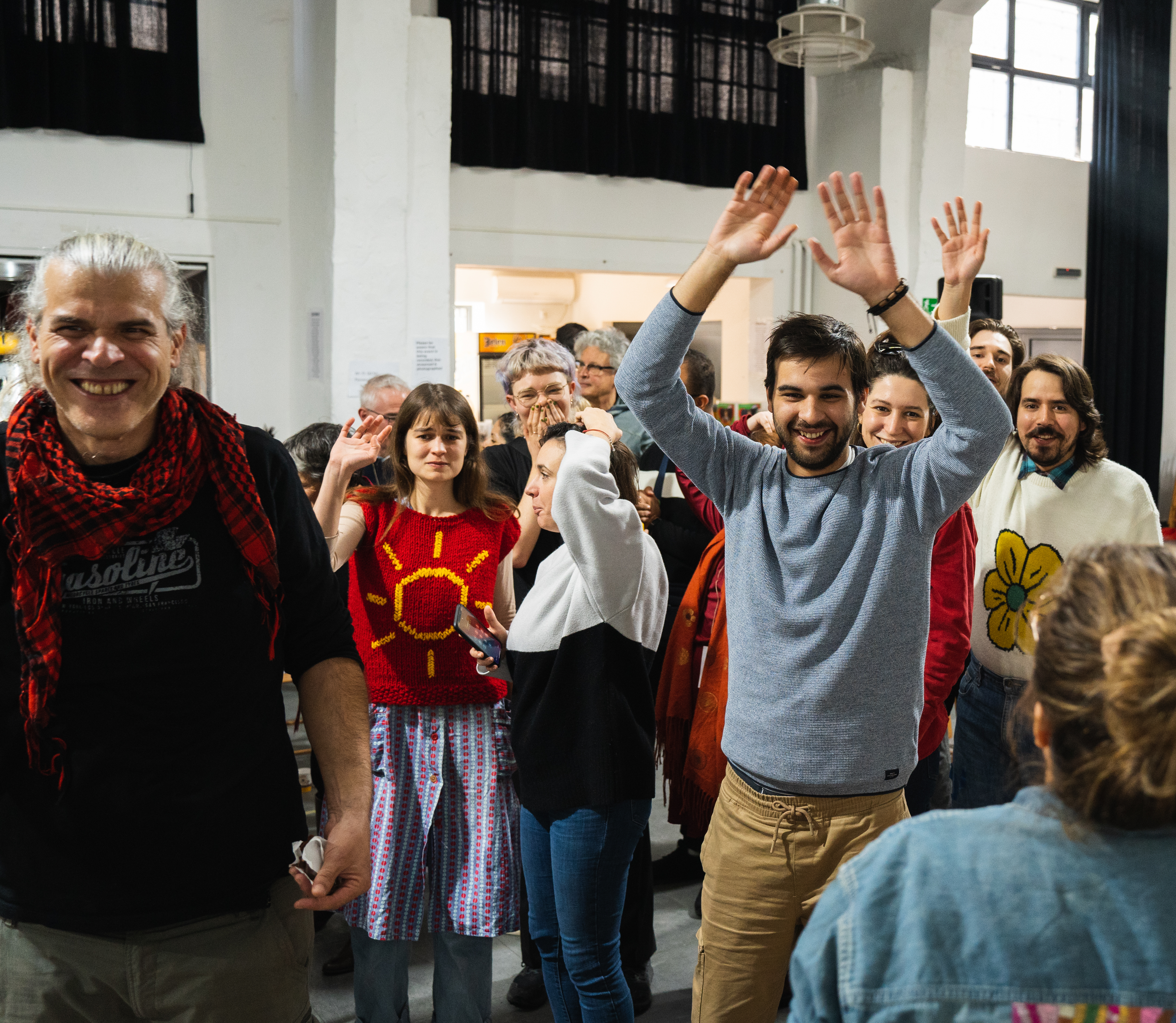 So rauschen wir wellenartig um- und ineinander und bemerken, bis wir ufern, gar nicht, dass wir ein Wir geworden sind. Als eine vom Hühnchen getretene Gruppe aus Losern der Loser, die unter ihrem knallfarbenden Rock den Ungehorsam versteckt, treten wir in die Realität des Festivalns und Gatherns. Manchmal schütteln wir Hände und lachen und klatschen und freuen uns herzlich und ehrlich. Manchmal werden wir sauer und heben den Saum. Da sind zum Beispiel Stücke, die Kinder nicht richtig ernst zu nehmen scheinen. Und Reden, die fast missionarisch klingen. Und da ist eine Lesung und Diskussionsrunde zum Dramenschreiben für und mit jungen Menschen mit Down-Syndrom. Es wird gelesen und geredet und geredet… und es ist keine einzige Person mit Down-Syndrom im Raum. Eine Handmeldung aus unserer Gruppe: Nothing about us without us! Das ist Othering1, und das ist nicht okay; eine weitere: And what about authorship?, Wem gehört das Gelesene denn überhaupt und warum sind manche Personen, die es urhebern, nicht da und warum seid stattdessen ihr hier.